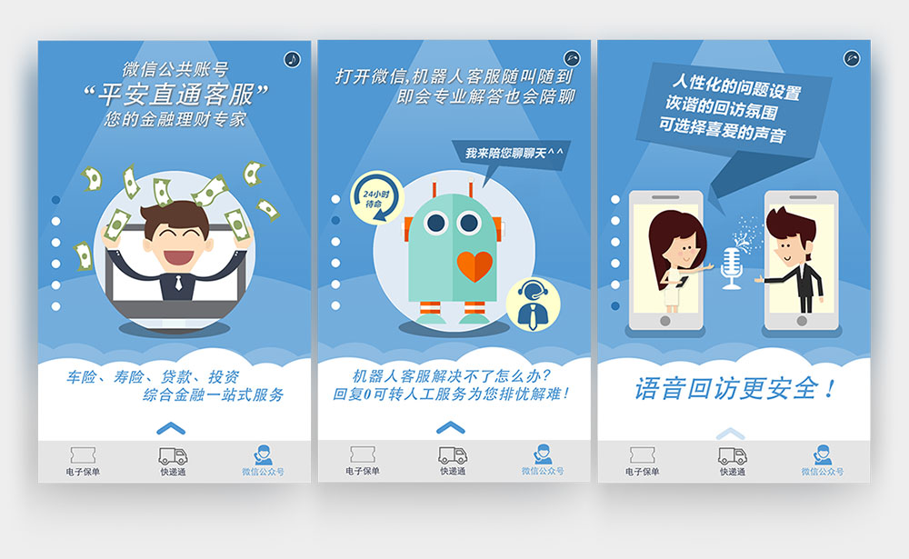 杭州app開發(fā),手機(jī)app制作公司,高端網(wǎng)站建設(shè)制作公司為您推薦手機(jī)H5開發(fā)案例-平安直通客服是平安直通保險(xiǎn)公眾賬號(hào)內(nèi),介紹平安直通客服的H5手機(jī)端頁(yè)面。從項(xiàng)目人群及瀏覽習(xí)慣出發(fā),以輕松的卡通形象配合幽默風(fēng)趣的文字,讓瀏覽者快速、便捷的了解平安直通客服的功能及介紹。
